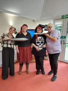 With decorations up we’ve started the day having great fun throwing and sinking multicoloured cannonballs in a pop up pirate ship and had some wild sword fights with inflatable swords.